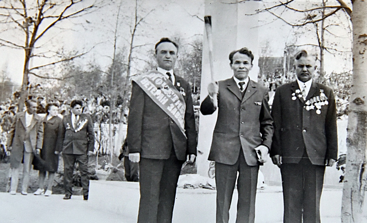 Обелиск открыли участник войны, слесарь цеха № 64, награжденный в мирное время орденом Ленина И. П. Вотинцев, групкомсорг одной из бригад цеха № 59 Е. Быкова и плановик цеха № 36 З. Н. Новикова. С восьмиметрового мраморного пилона картинно спадает покрывало, и в глаза бросаются четкие объемные цифры: «1941-1945» – годы нашей всенародной борьбы против гитлеровского фашизма. У обелиска встает почетный караул, наступают волнующие минуты перед подачей команды зажечь у обелиска Вечный огонь. С зажженным факелом в руках на площадку поднимаются кузнец завода, участник войны Н. Г. Коробейников и его ассистенты – участник войны, слесарь М. С. Юрьев, ветеран труда завода А. А. Карасев. На возвышении у обелиска, в центре пятиконечной звезды, вспыхивает пламя — символ вечной памяти героям фронта и тыла.
