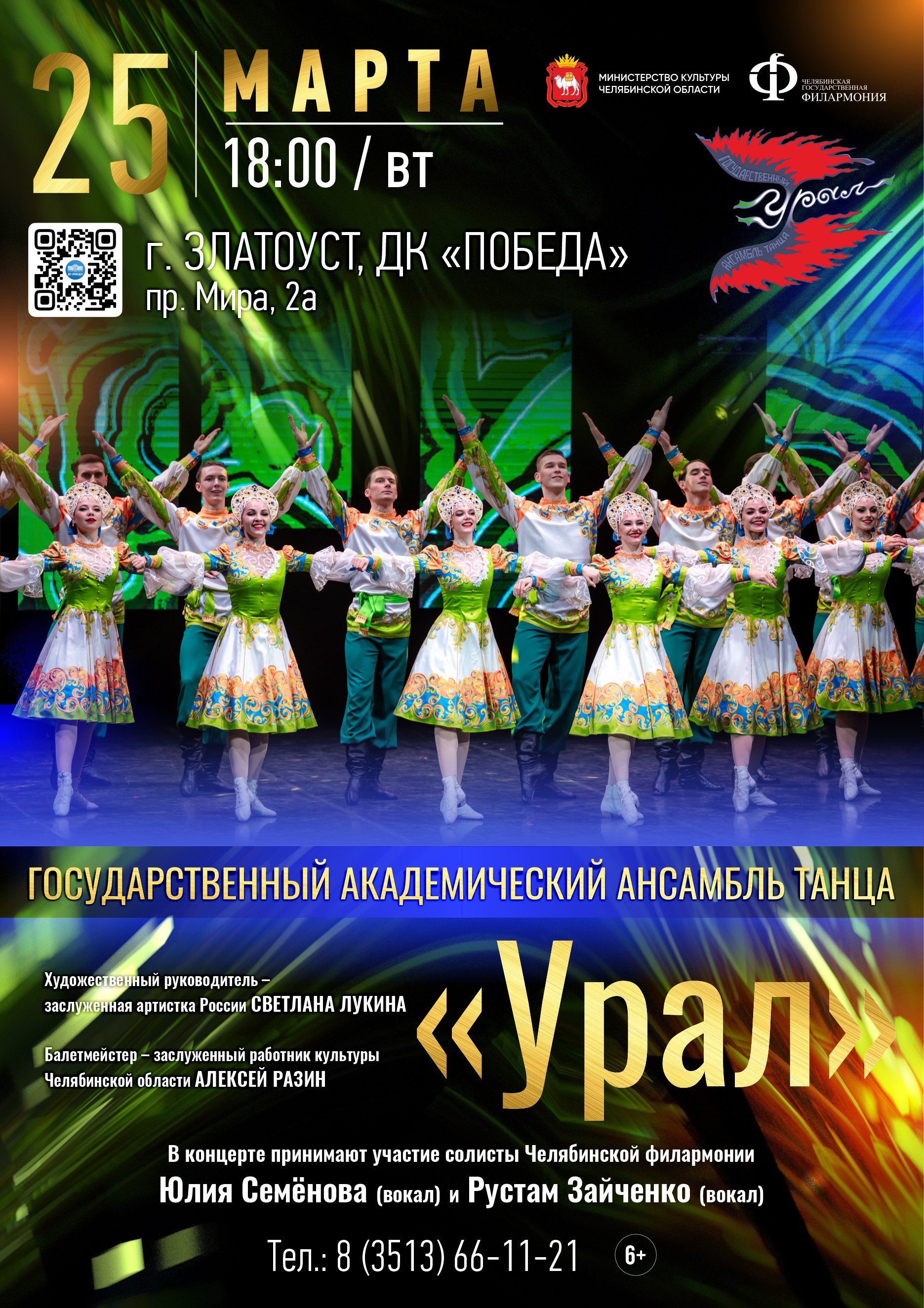 Это будет шикарный концерт с участием Государственного академического ансамбля танца «УРАЛ», оркестра и солистов Челябинской государственный филармонии Рустама Зайченко и Юлии Семеновой!
